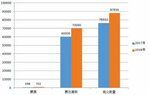 ☝ 图表三:相对2017年,2018年广州遮阳门窗展展商同比增长 17.39%,展出面积同比增长16.67%,观众同比增长15.26%