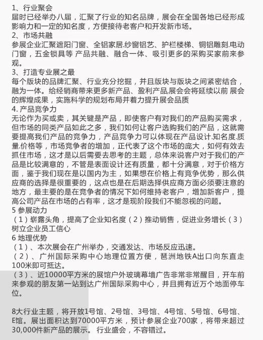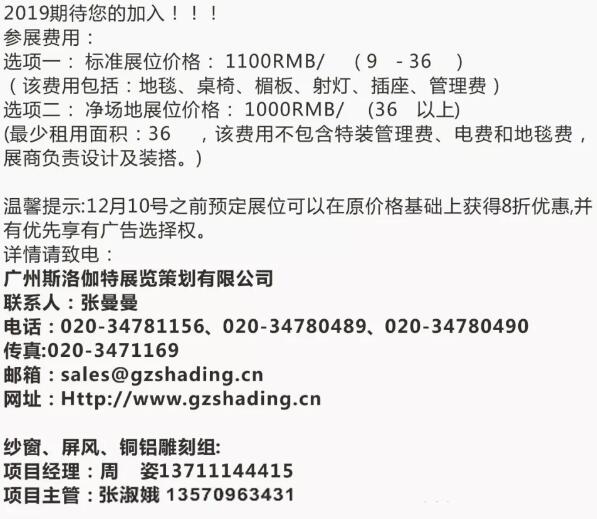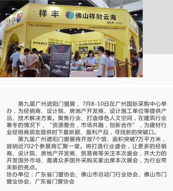 汇聚建筑遮阳、电动门窗、道闸、停车场系统、门窗纱窗、户外家具、铜铝雕刻、围栏护栏、楼梯扶手、全铝家居、五金锁具等专业盛会,专业打造贸易交流平台,请认准我们这个团队!我们准备好了,招展正式开始,等您来!