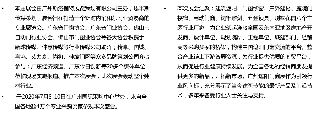 2020广州遮阳门窗展已于7月10日圆满落幕。当日的展会精彩盛况仍然历历在目,让人印象深刻。为期3天的盛况让大家见识到作为“行业风向标”展会的吸引力,在大家的热切期盼下,信息量满满的展后报告终于火热出炉!