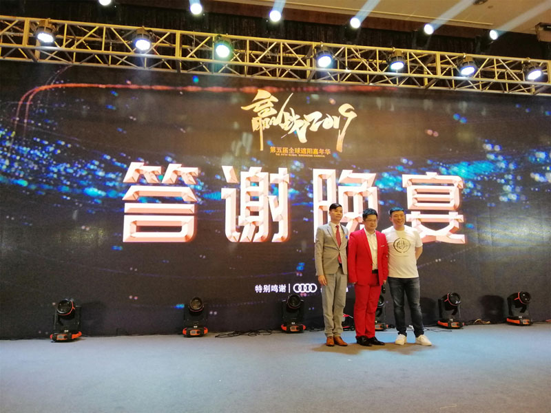 义乌建博会周董事长(左)、歌手曹磊(中)、中国遮阳商城俞董事长(右)于中国遮阳商城嘉年华活动中合影留念
